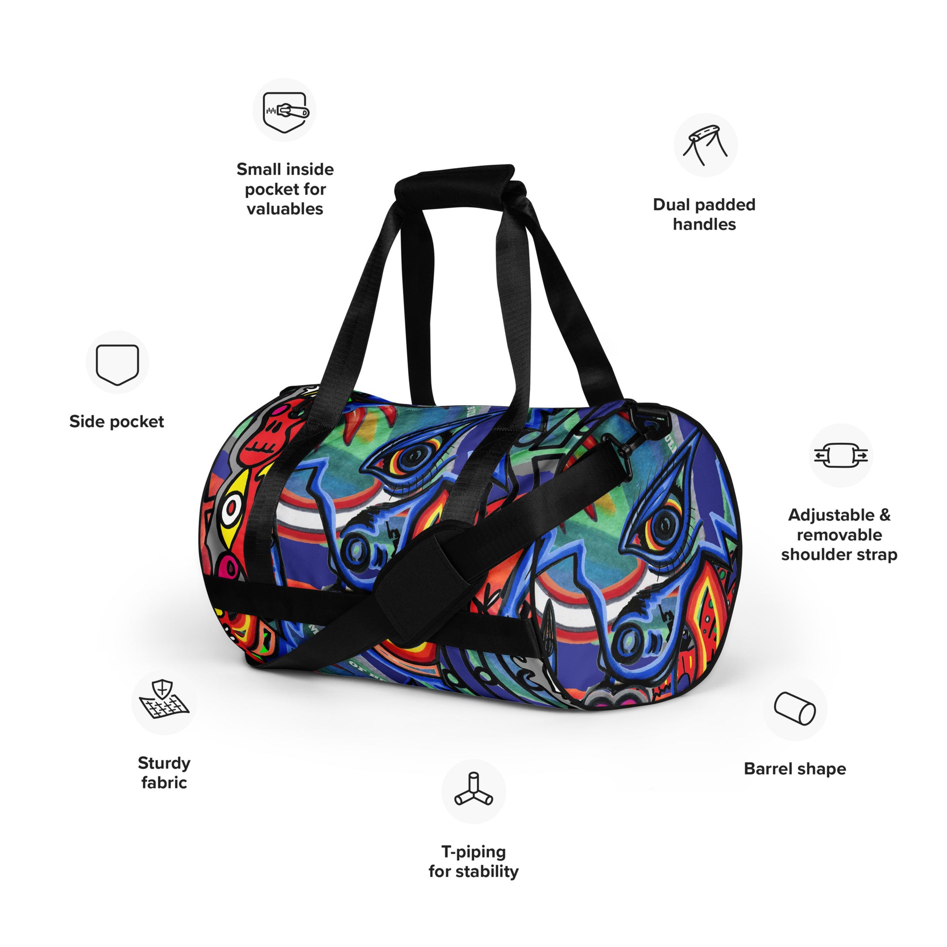 Ready to get your fitness on? Add some punch to pumping iron with this all-over print gym bag. Made from 100% polyester and sturdy, water-resistant fabric, this bag is fun meets function. And it’s got pockets!