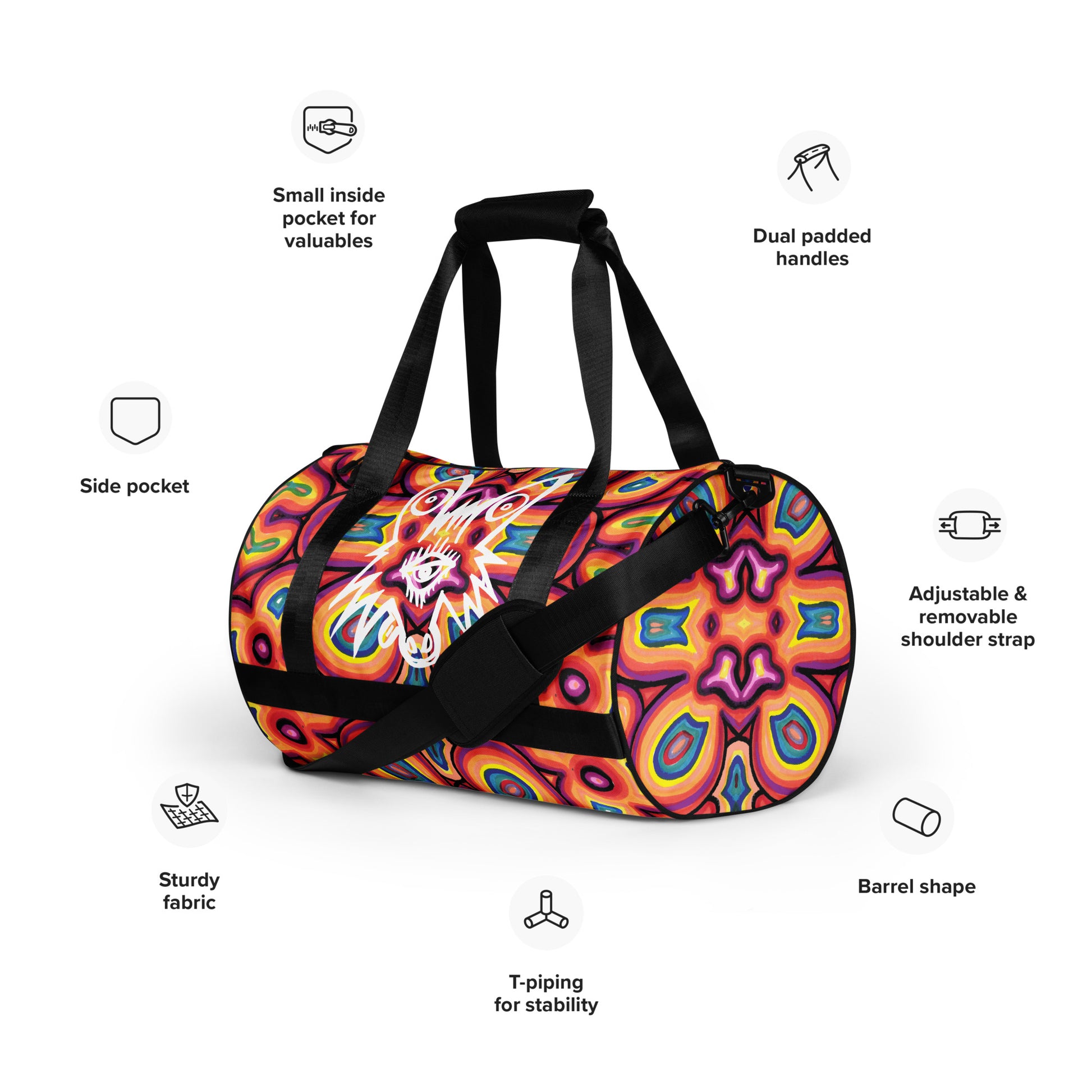 Ready to get your fitness on? Add some punch to pumping iron with this all-over print gym bag. Made from 100% polyester and sturdy, water-resistant fabric, this bag is fun meets function. And it’s got pockets!